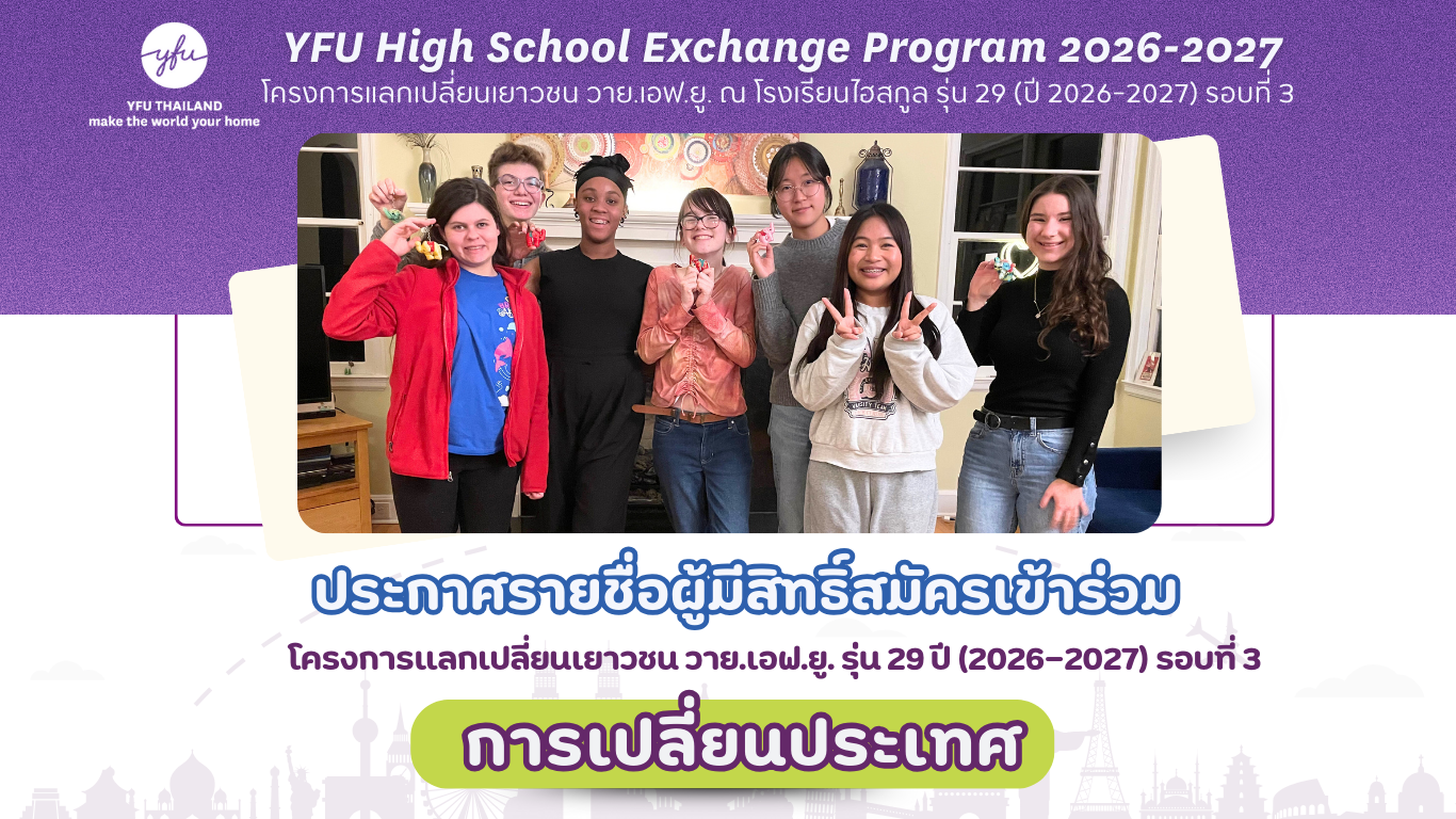 ประกาศรายชื่อผู้มีสิทธิ์สมัครเข้าร่วมโครงการ วาย.เอฟ.ยู. รุ่น 29 ปี 2026-2027 รอบที่ 3 การเปลี่ยนประเทศ
