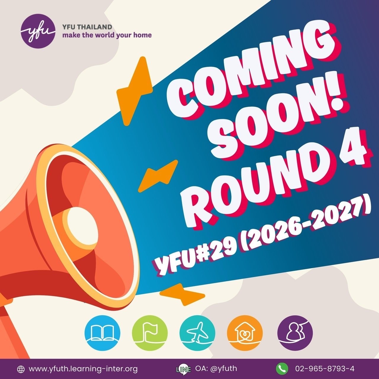 วาย.เอฟ.ยู. จะเปิดรับสมัครนักเรียนเข้าร่วมโครงการ โครงการแลกเปลี่ยนเยาวชน วาย.เอฟ.ยู. ณ โรงเรียนไฮสกูล รุ่น 29 (ปี 2026-2027) สามารถติดตามระเบียบการรับสมัครและสอบคัดเลือก และใบสมัครได้ที่นี้เร็วๆ นี้